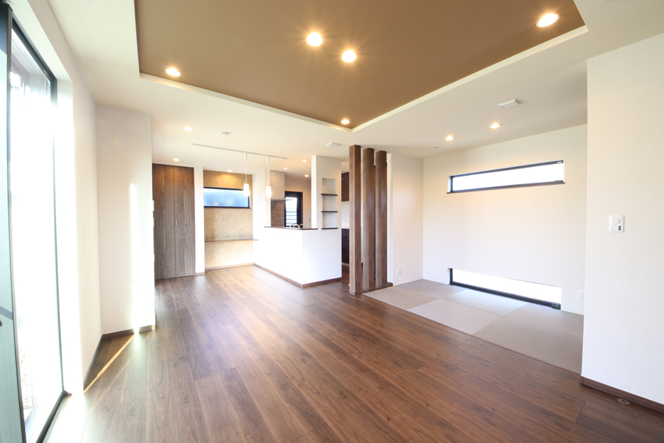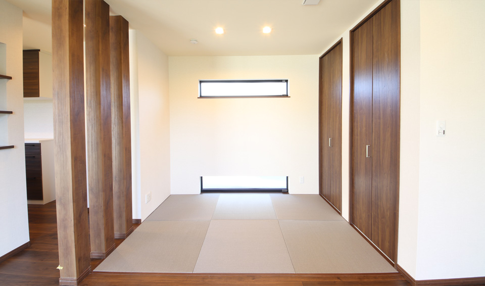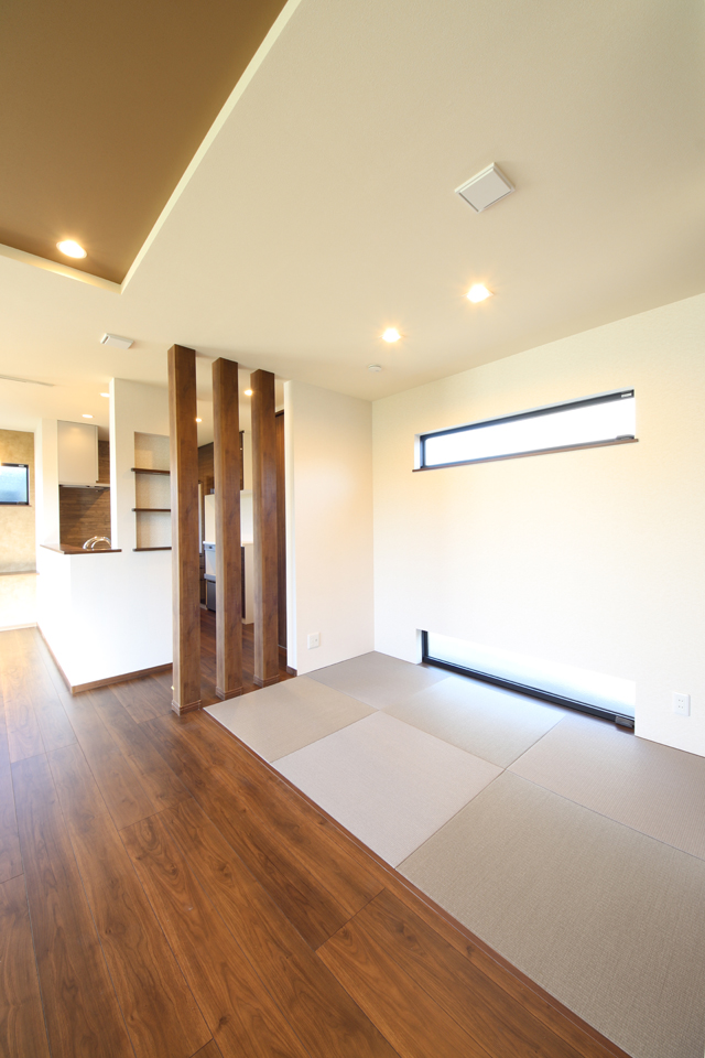 リビングから続いているデザイン性のあるモダン和室は開放感はそのままに、心地よい独立性を実現しています。それぞれのパーソナルスペースを保ちながらも、ご家族の存在を感じられるスペースです。