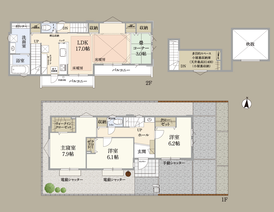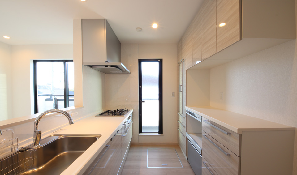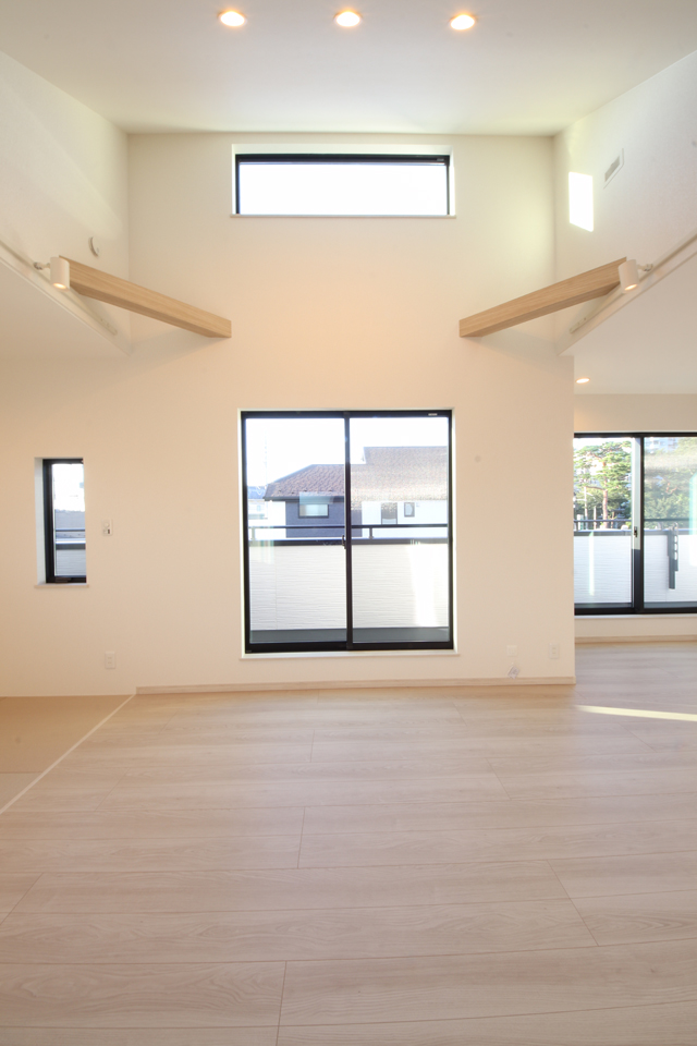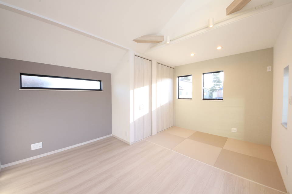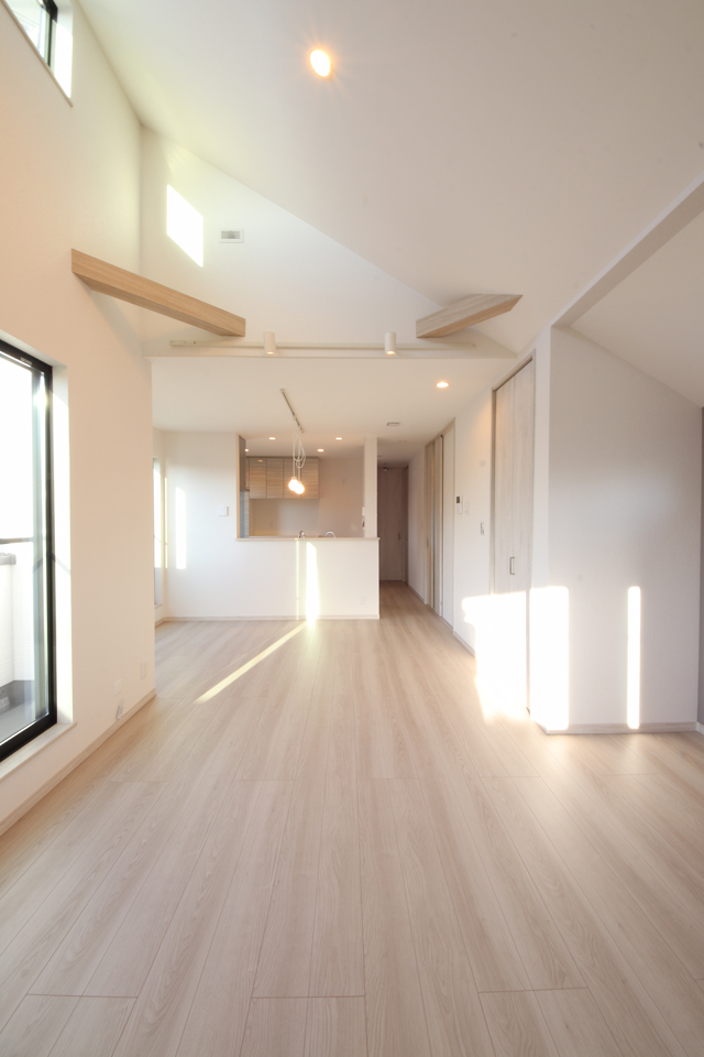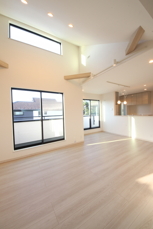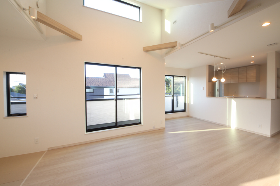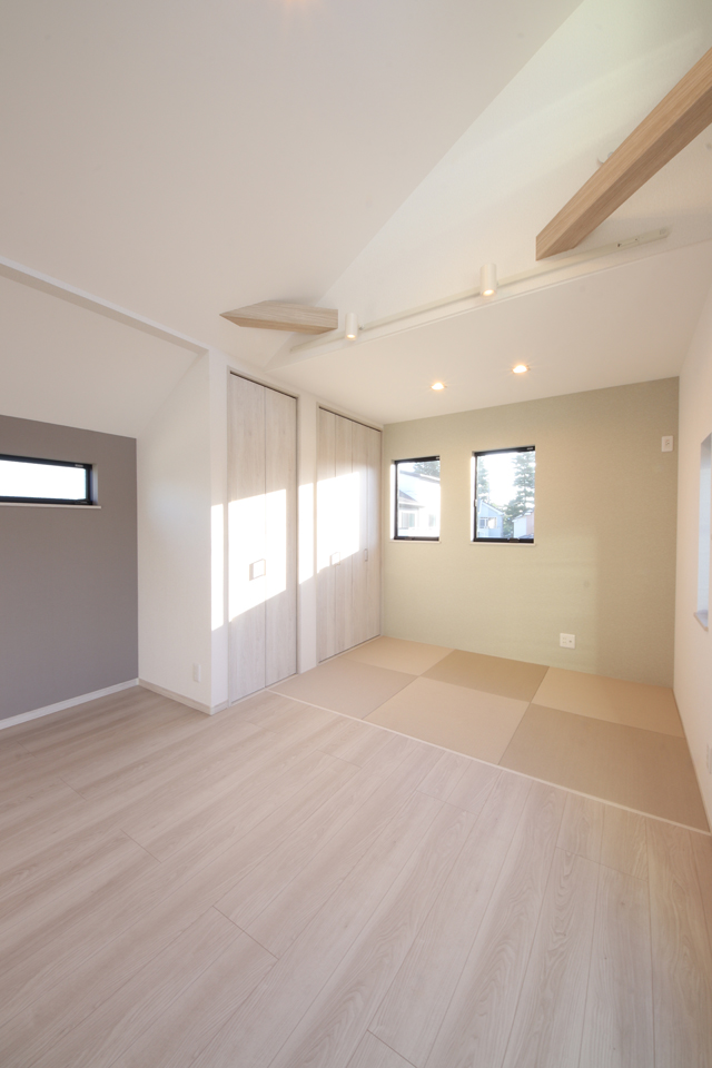 縦の広がりが、心地よい吹き抜けをご家族の居場所となるリビングダイニングに採用しました。空からの光が爽やかに注ぐ空間の中で、団欒や憩いの時間をゆったりと過ごすことができます。また、畳コーナーは子供たちの遊び場やお昼寝スペースにも使える自由空間です。
